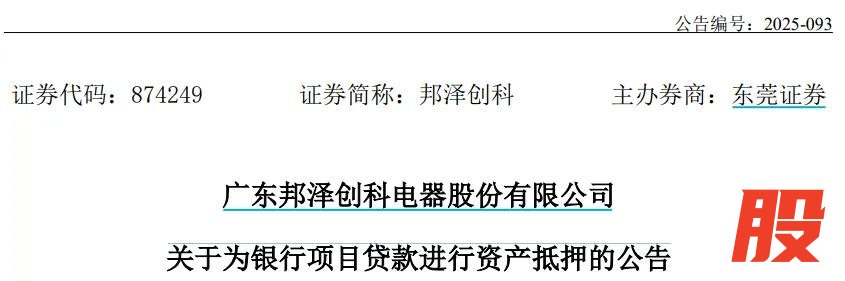 2025年8月,邦泽创科发布了一份《关于为银行项目贷款进行资产抵押的公告》,披露为保障电器制造总部基地项目建设工程的顺利实施,拟向金融机构额外申请不超过人民币6亿元的项目贷款授信额度,公司将以自有的位于东莞市厚街镇石角路西侧的不动产(证书编号“粤(2025)东莞不动产权第0058134号”)为本次贷款提供抵押担保。