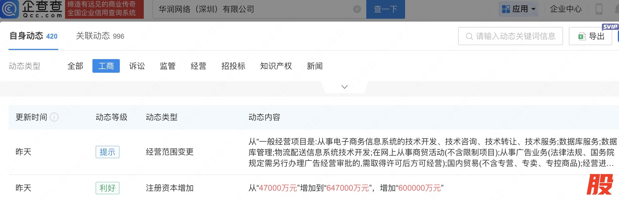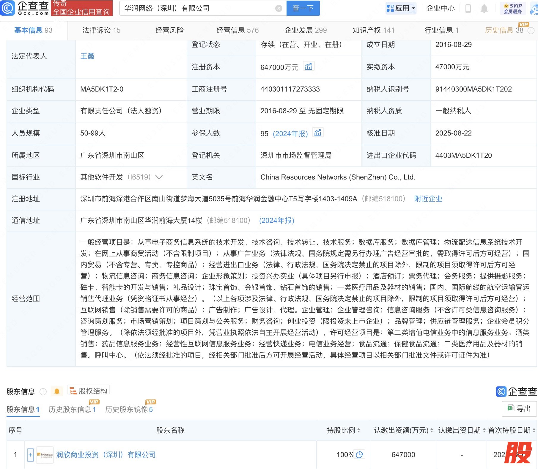 近日,华润网络(深圳)有限公司发生工商变更,注册资本由4.7亿人民币增至64.7亿人民币,增幅约1277%。企查查信息显示,该公司成立于2016年,法定代表人为王鑫,经营范围包括数据库服务、数据库管理、物流配送信息系统技术开发等,由润欣商业投资(深圳)有限公司全资持股。