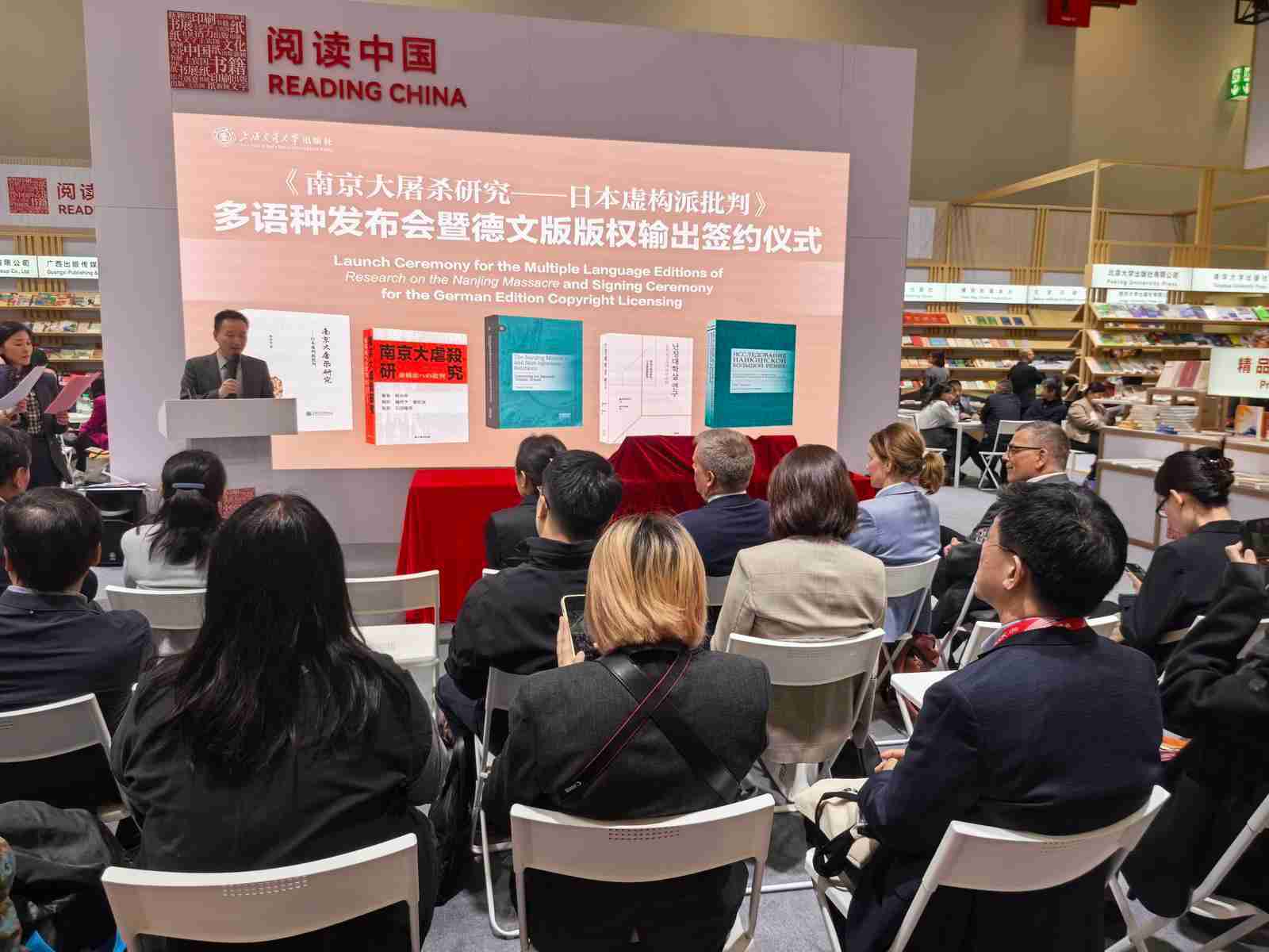 活动现场,《南京大屠杀研究——日本虚构派批判》英、韩、日、俄四语种版本集中亮相;德文版版权的输出,标志着这部“守护历史记忆”的学术著作在国际学术交流领域迈入全新发展阶段。